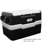 • Gross Capacity: 43 litres • Input Power: DC 12V/24V/240V • Rated Power: 60W • Temperature Range: -18°C‑+10°C • External Dimensions (mm): W645xD425xH440 • Net Weight: 19kg • Colour: Black & Grey • SKU: 0704
